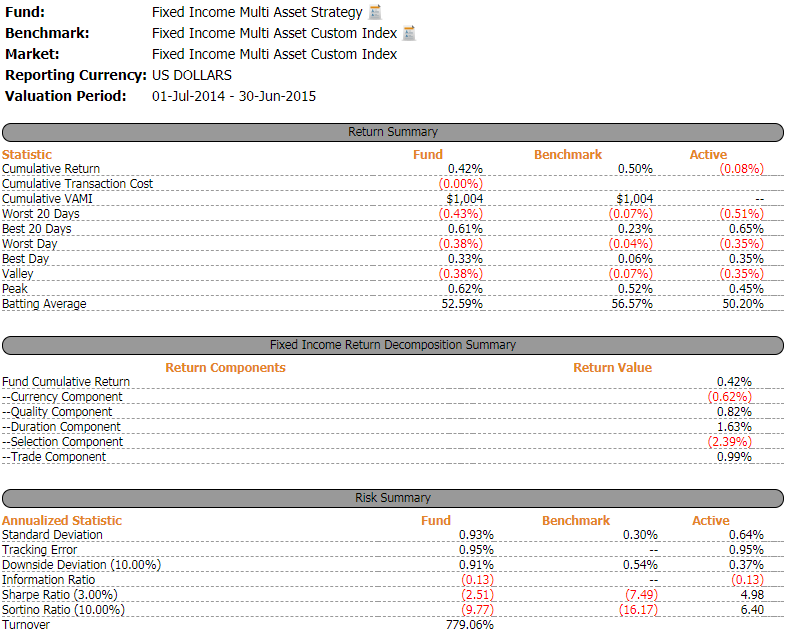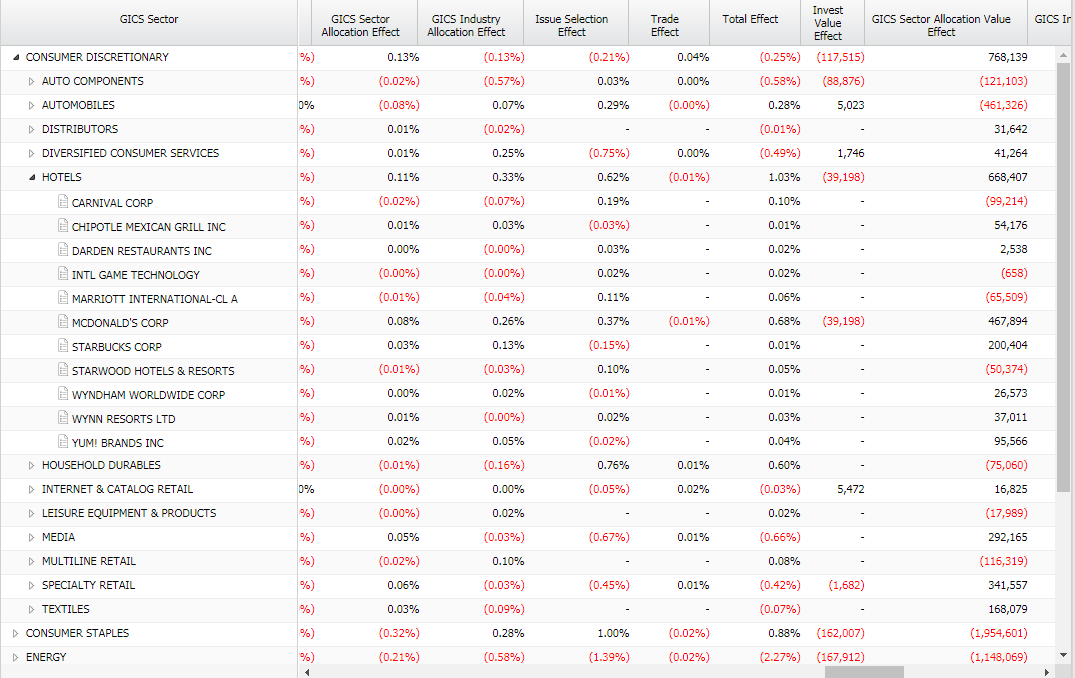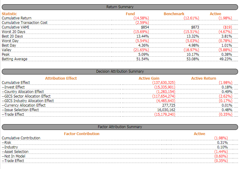ODIN Attribution provides clients with the flexibility to select from a suite of best of breed models to meet their varied needs. Our proprietary Enhanced Brinson Fachler model empowers investment professionals to receive analytics which are based on how they actually make their investment decisions. If there is consistently applied logic and data to support it, our attribution engine can incorporate it into a decision tree - on the fly. Have a quant scoring method with multiple steps? Each step can be part of a decision tree and determine the alpha and risk generate by each. In combination with our ODIN Performance product, ODIN Attribution can handle any asset type and strategy. ODIN Attribution also provides the flexibility to select more traditional Brinson models, including a classic 2 step Brinson Beebower. Foreign exchange impact may be treated in a variety of ways, including decomposition or Karnosky Singer. Whether it be multi-asset or a traditional bottoms-up stock picking strategy, ODIN Attribution offers a way to provide economically meaningful analytics.